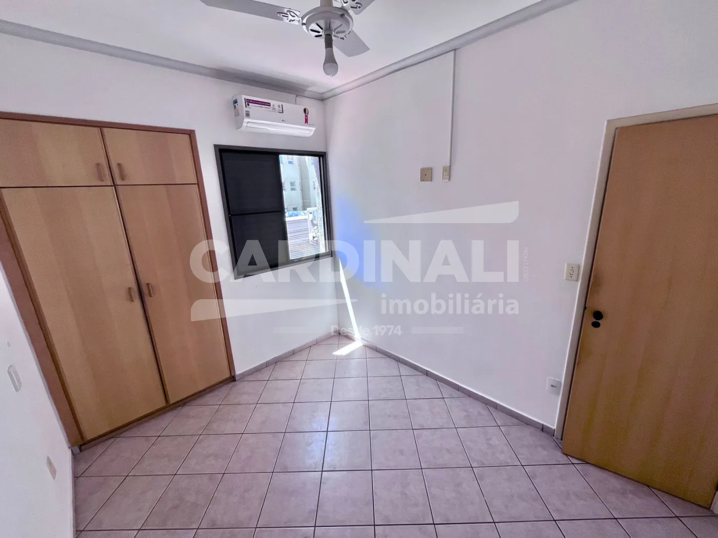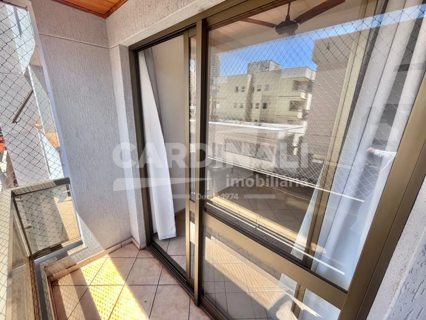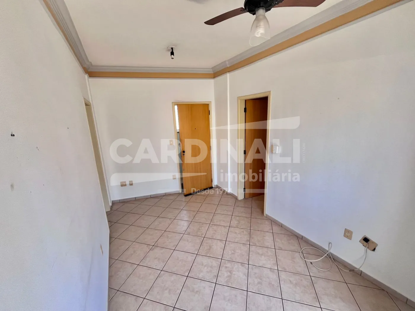 - Sala com ventilador de teto e sacada;