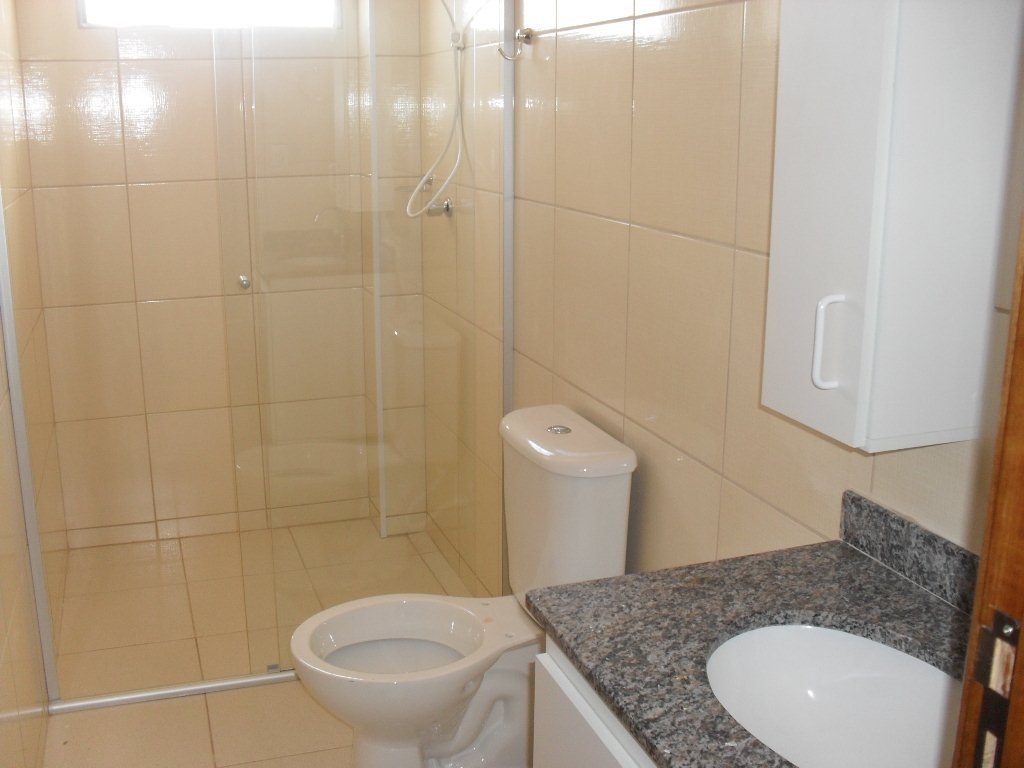 Acabamento em piso frio, cozinha com gabinete, banheiro com gabinete e box blindex.