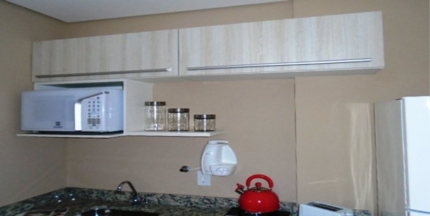 Cozinha com armários, geladeira, cooktop, micro-ondas e filtro de água.