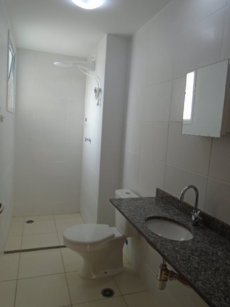 Teto laje; acabamento em piso frio; banheiro, cozinha e área de serviço com azulejo até o teto; banheiro com gabinete, blindex e chuveiro; cozinha com gabinete e armários.