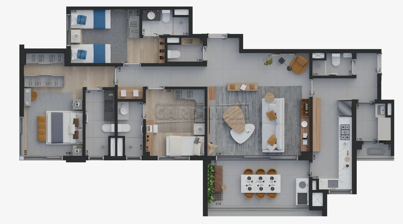 A combinação de suítes espaçosas e uma varanda gourmet permitem que você desfrute do conforto sem igual, proporcionando refúgio e diversão sem sair de casa. A sofisticação dos acabamentos, como porcelanato Portobello e piso vinílico nos quartos, eleva o padrão de vida, enquanto a infraestrutura do condomínio, completa com piscina, academia e áreas de lazer, assegura que sua família tenha sempre o melhor entretenimento à disposição. A segurança é reforçada com a guarita blindada e serviços adicionais que simplificam o dia a dia.
