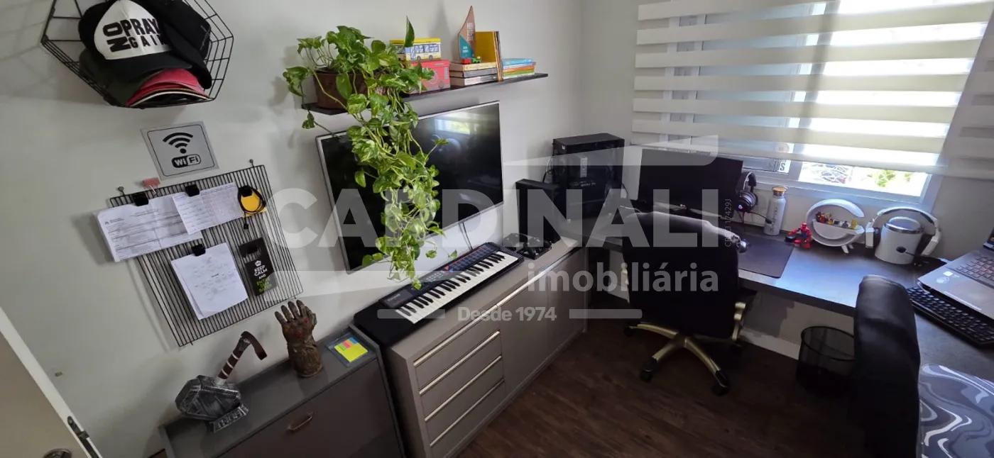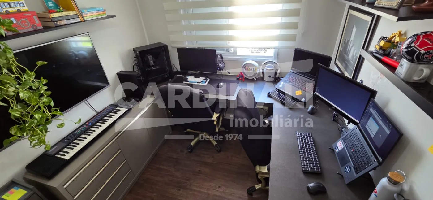 Terceiro dormitório transformado em escritório completo, ideal para home office,