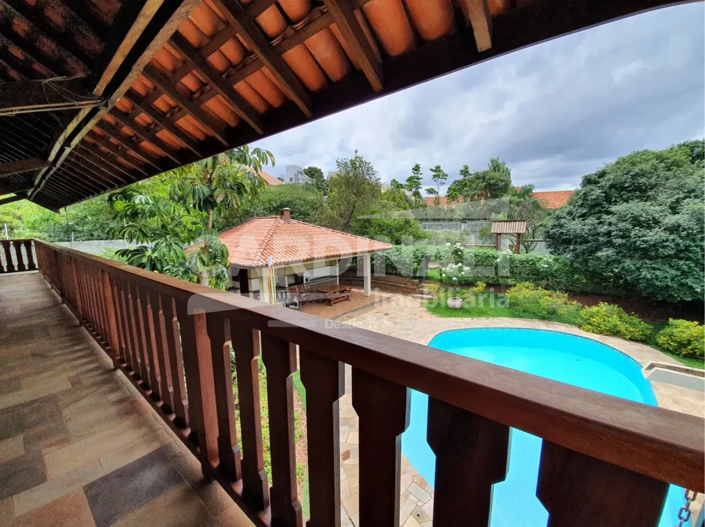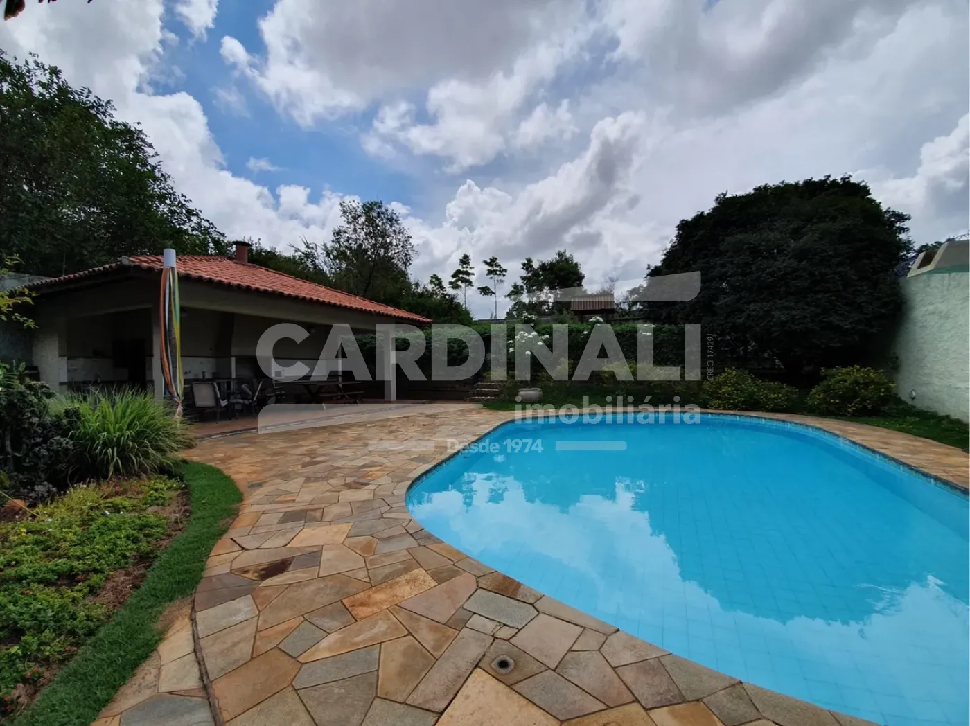 Quintal com piscina, churrasqueira e espaço gourmet, oferecendo um perfeito cenário para entretenimento