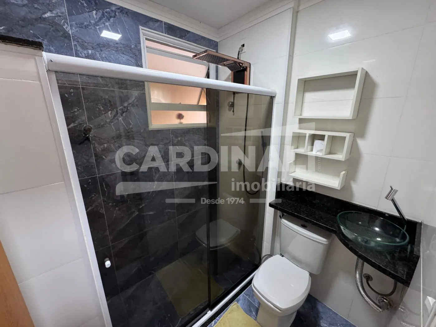 ? Banheiro social com fino acabamento, box em vidro e nicho embutido