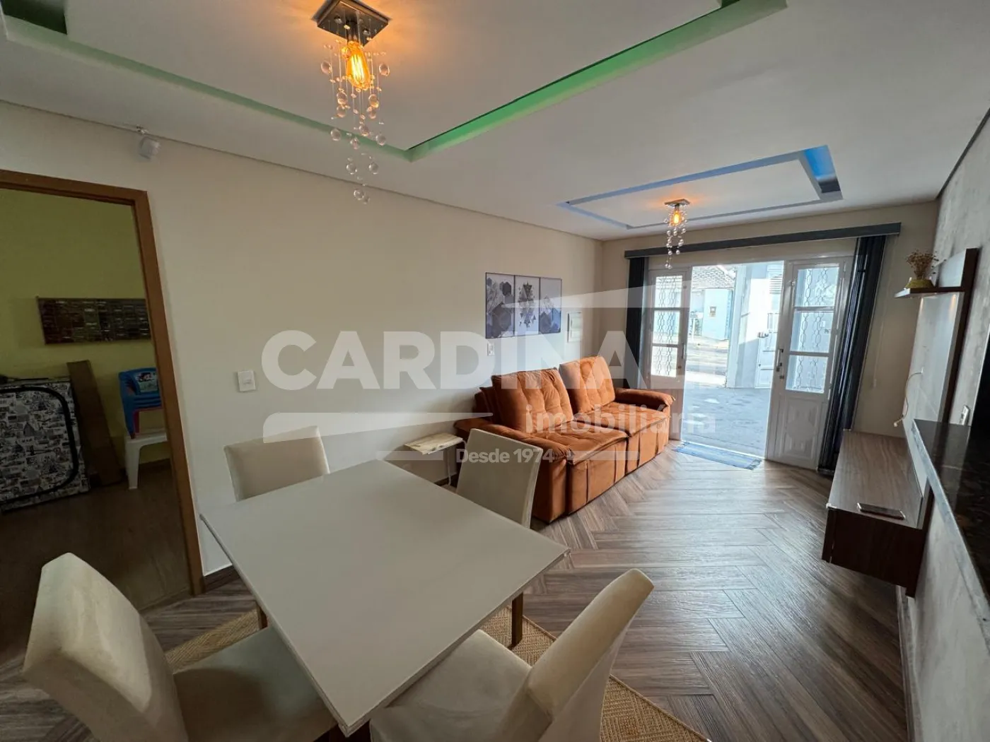 ? Sala de estar integrada à sala de jantar, com acabamento em gesso e iluminação em LED