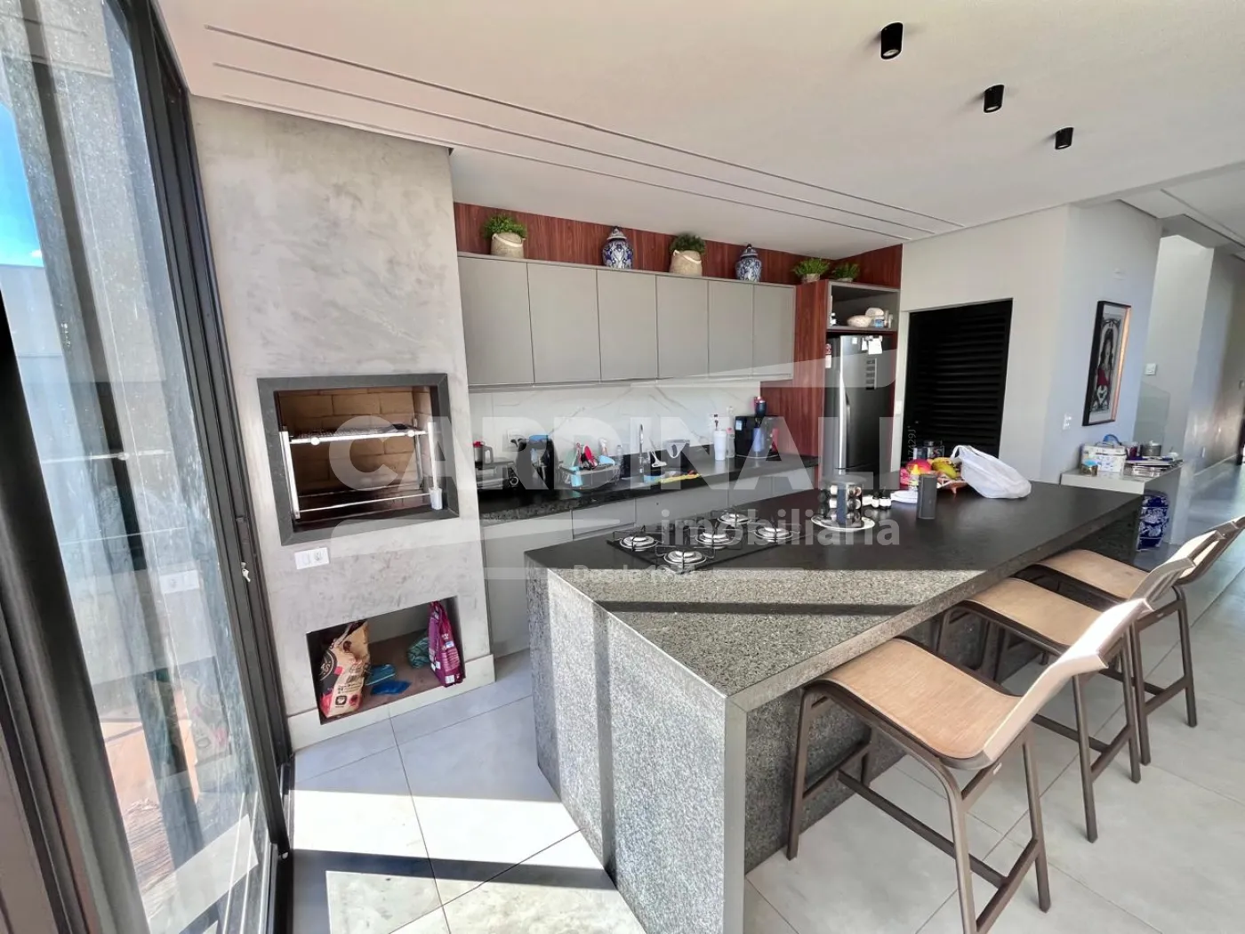 -Cozinha ampla com armários, gabinete, cooktop e churrasqueira;