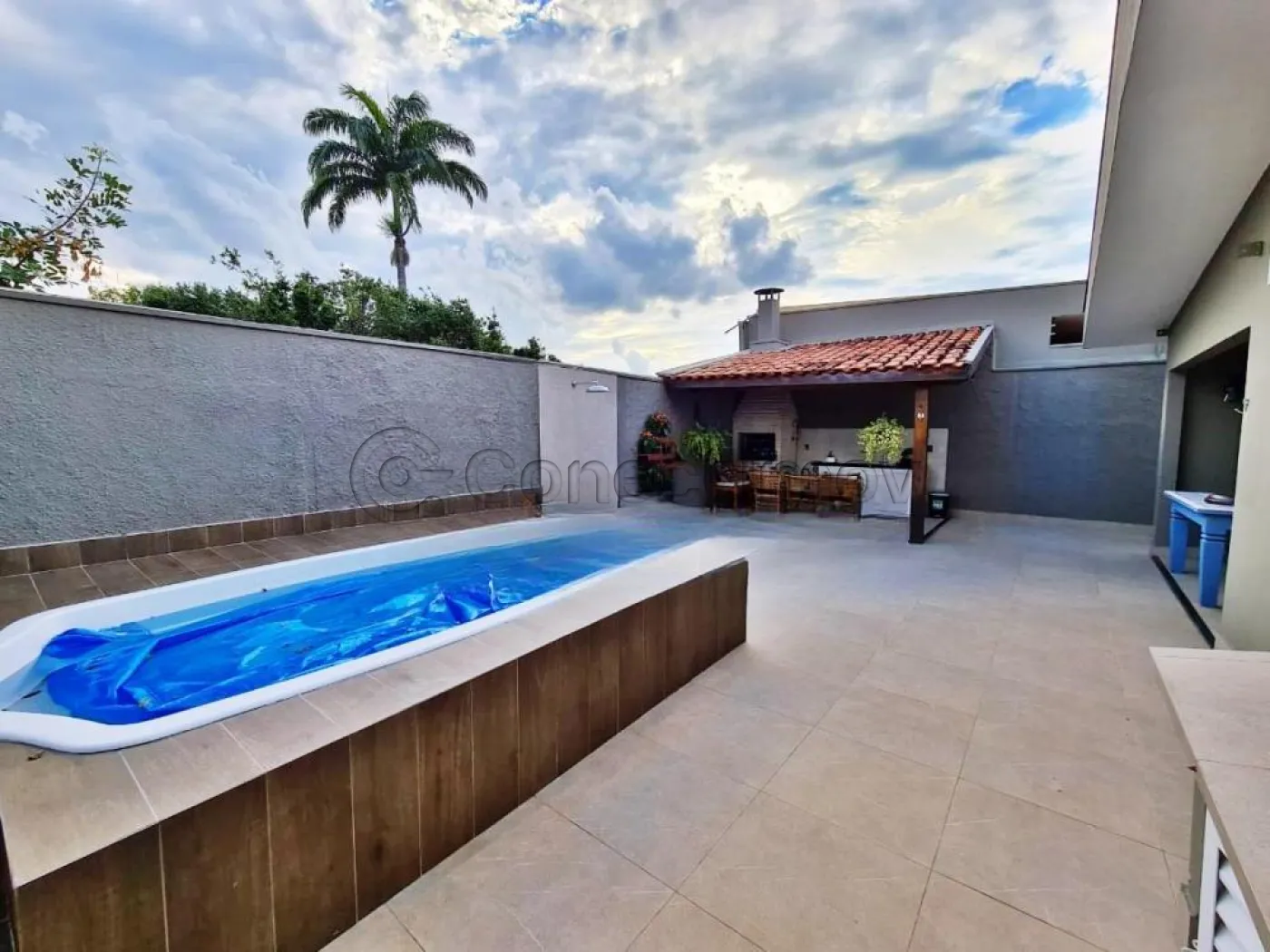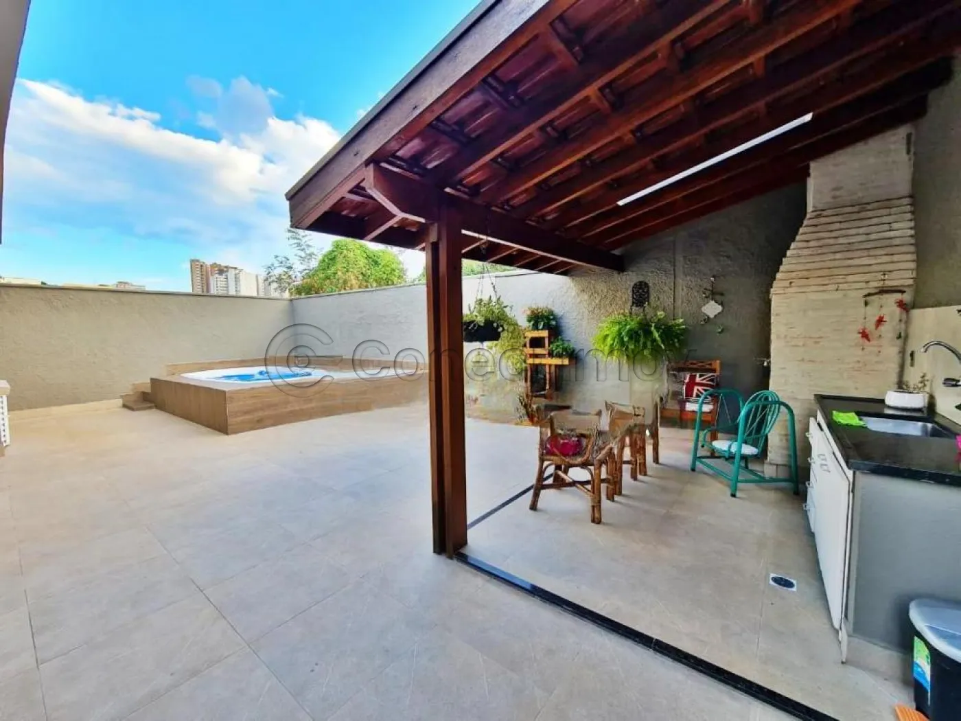 • Área gourmet extensa com churrasqueira e piscina, oferecendo lazer completo