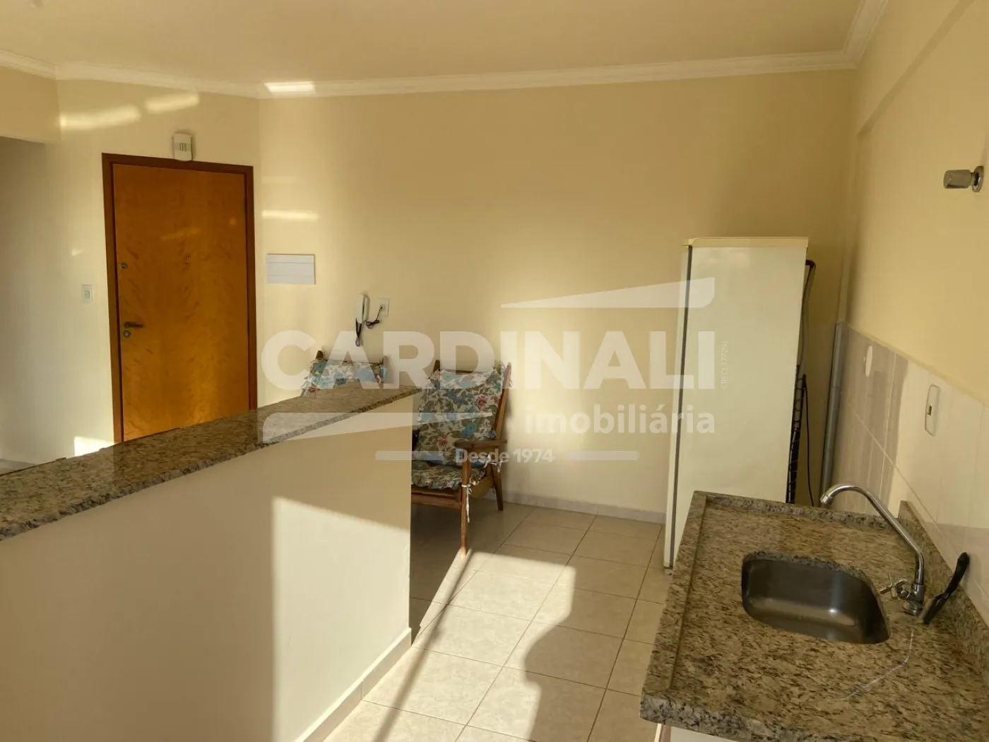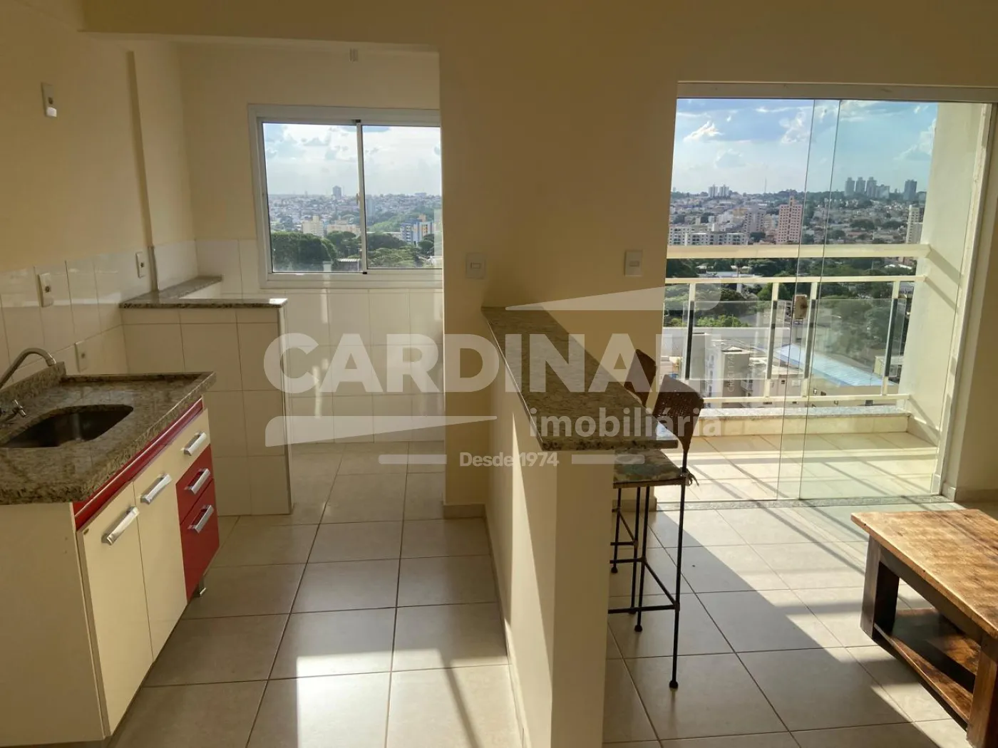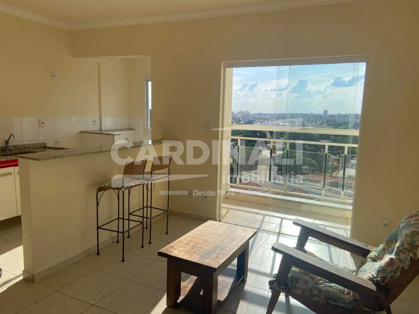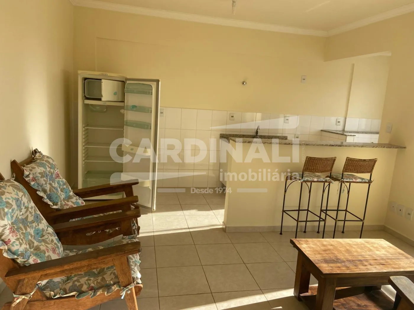 - Cozinha americana com balcão, 2 banquetas e geladeira