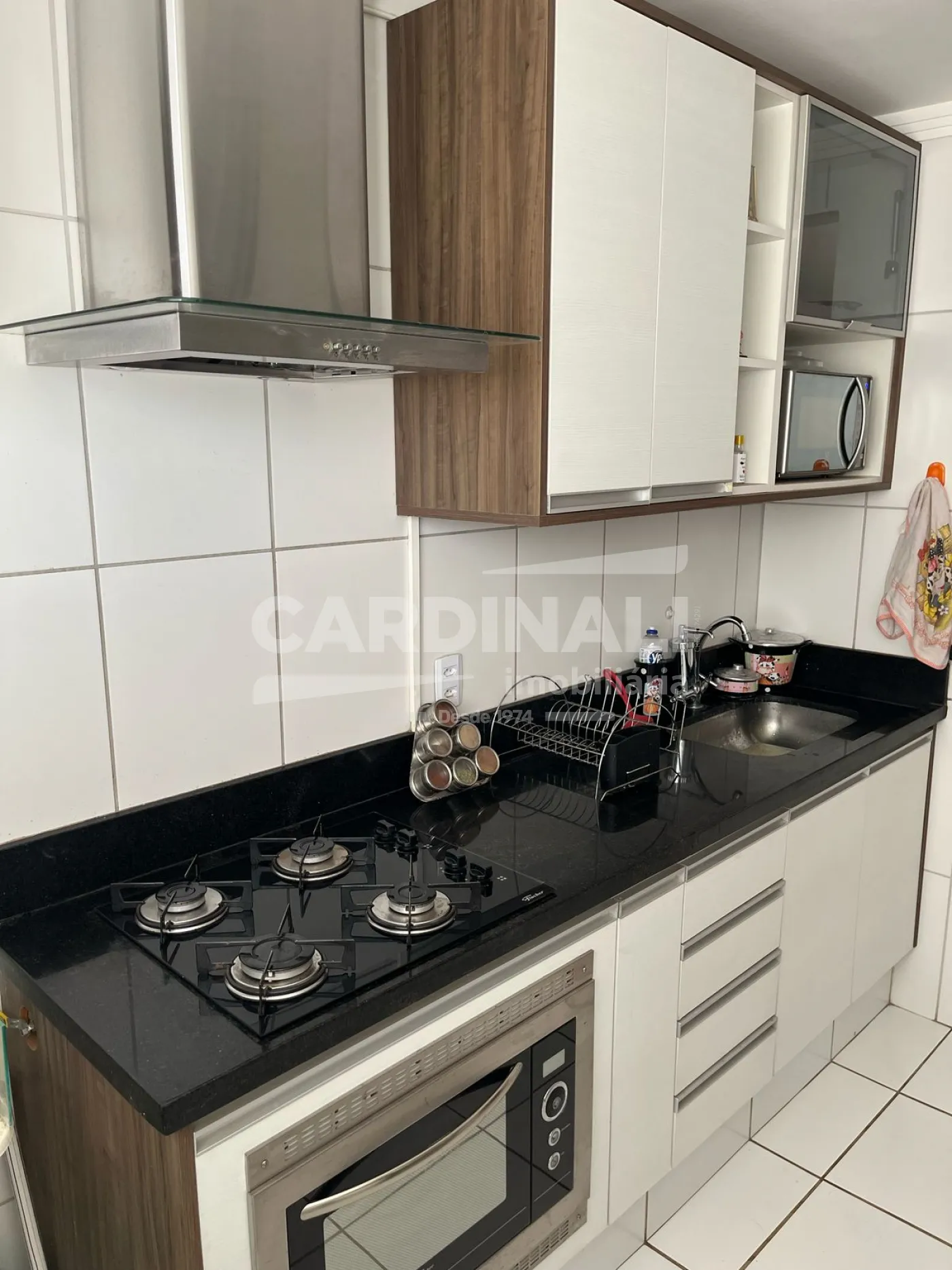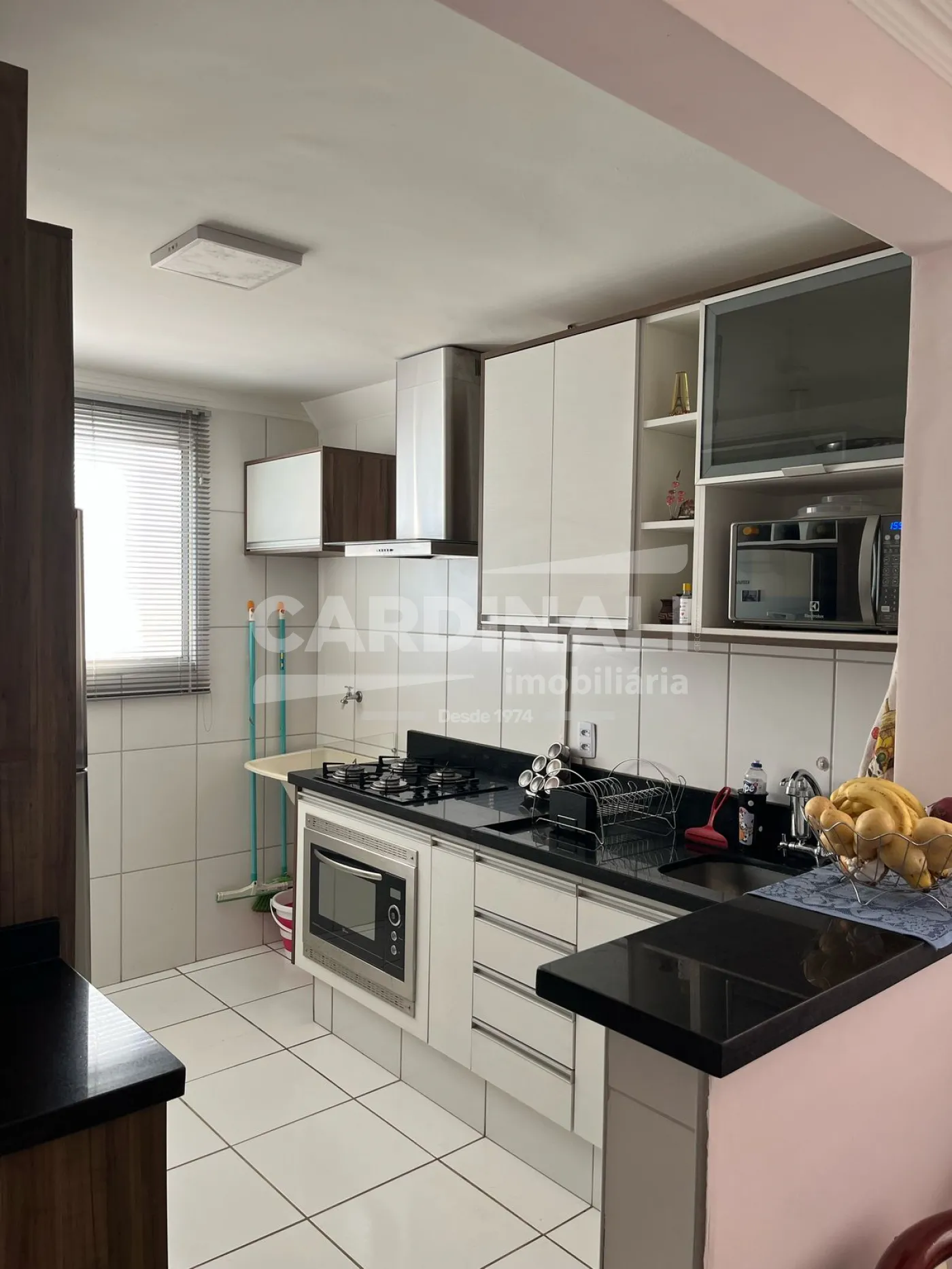 • Cozinha com forno elétrico, cooktop e armários, maximizando funcionalidade