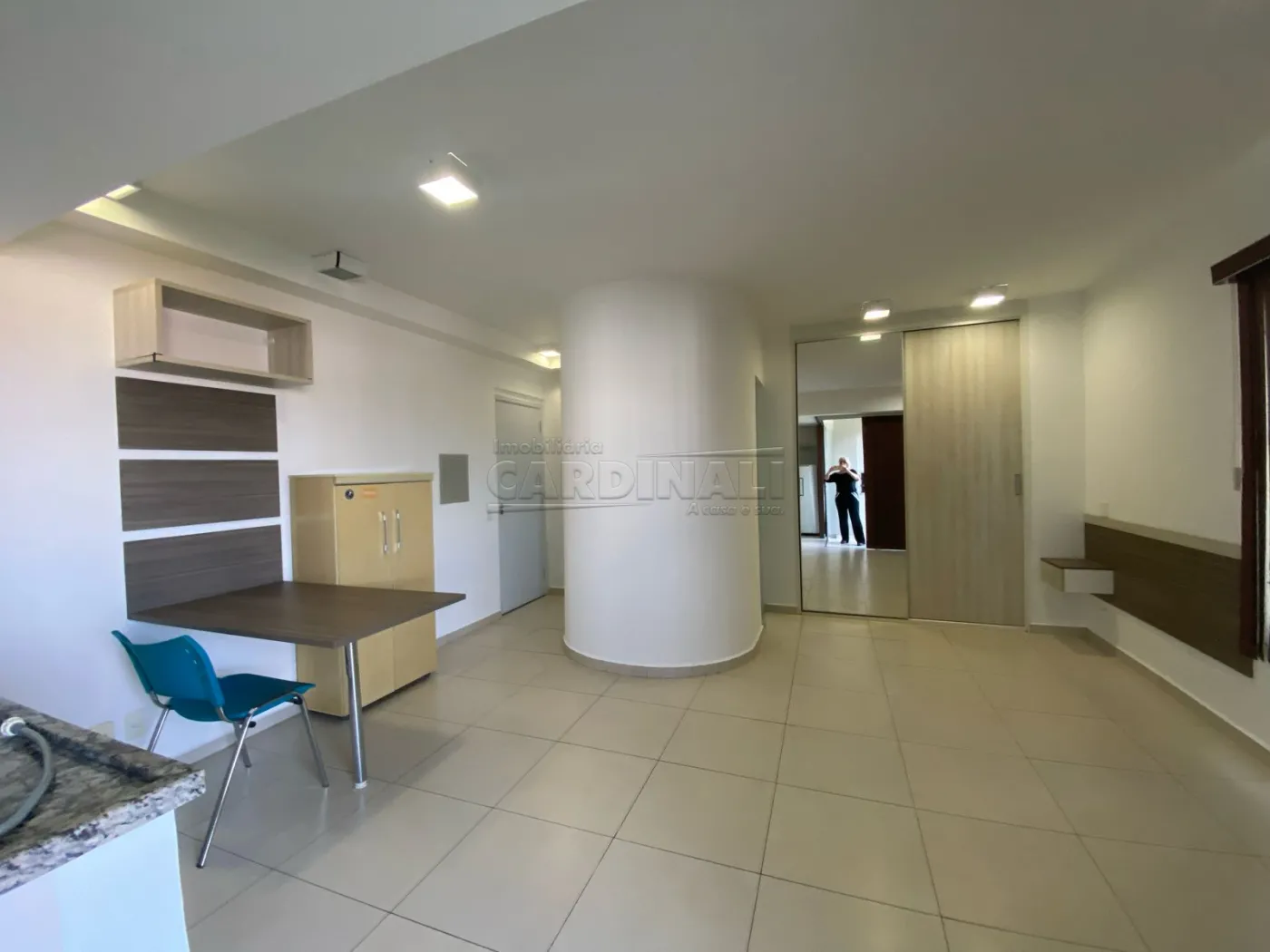• Sala com armário e mesa embutida oferecendo praticidade para suas atividades diárias
