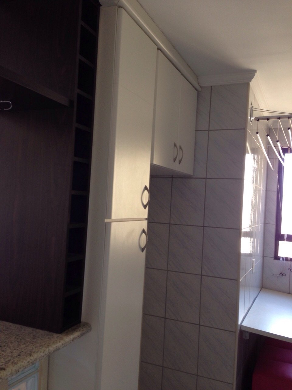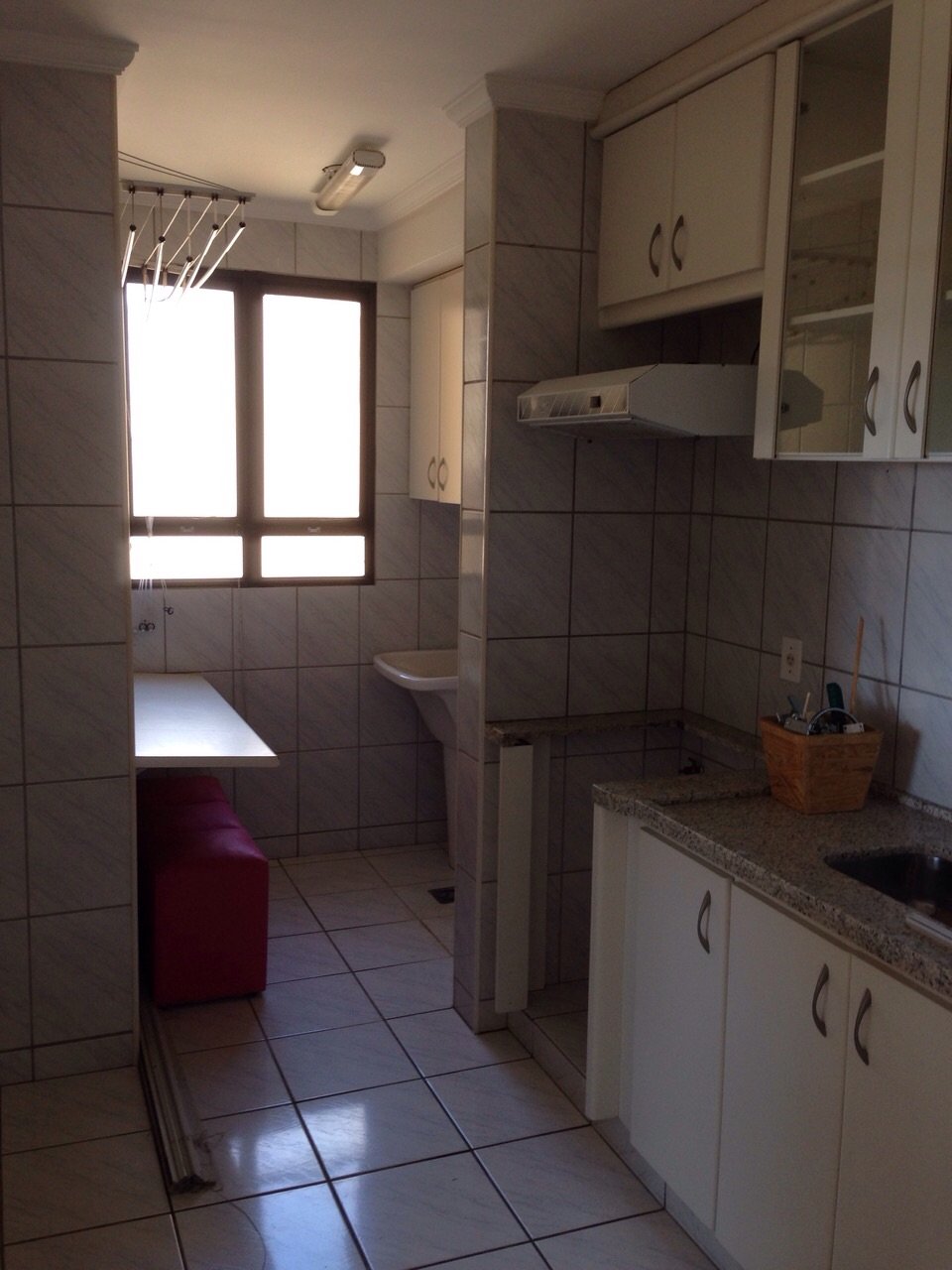 • Cozinha equipada com armários e azulejos até o teto, trazendo funcionalidade ao preparo de refeições