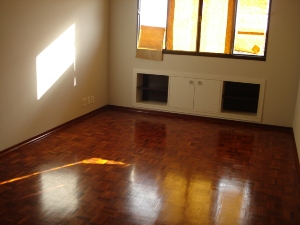 Acabamento em piso frio e taco. Teto em laje.