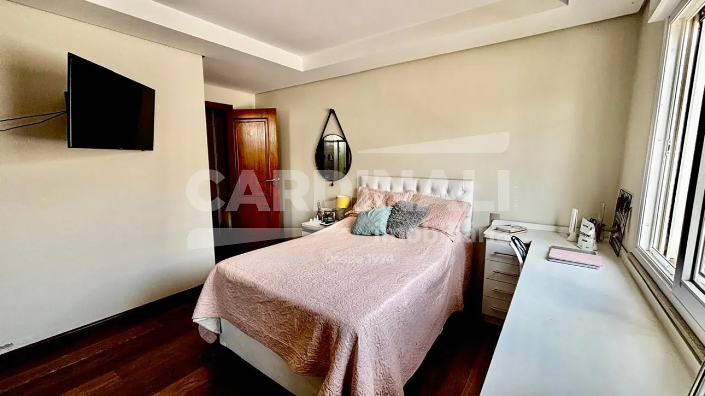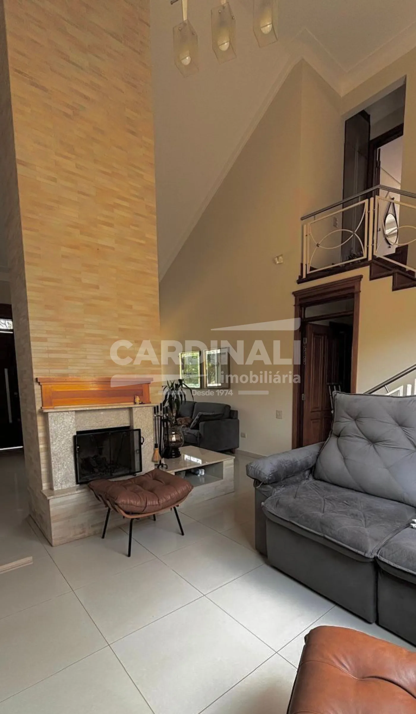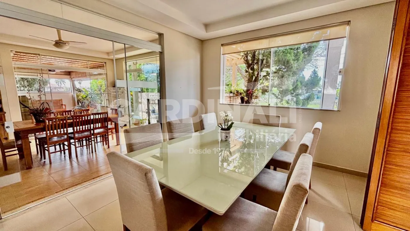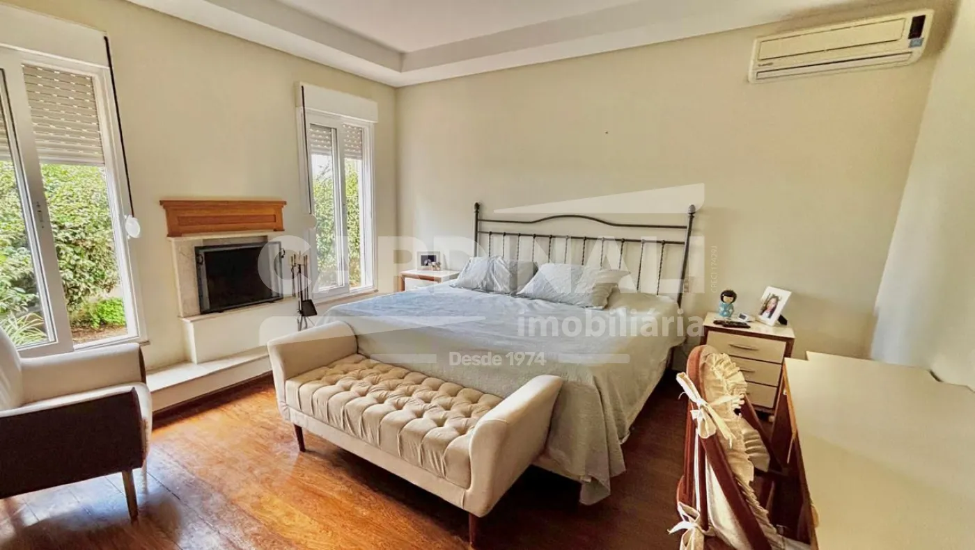 3 dormitórios com armários, sendo 3 suítes, 1 suíte no piso superior e 2 no piso térreo, suíte master com lareira e closet, banheira com hidromassagem, localizada no piso inferior, 2 salas integradas (sala de estar e TV), lareira na sala, 1 sala de jantar, 1 cozinha com armários, 3 banheiros das suítes + 1 lavabo, 1 área de serviço com armários, 1 despensa, 4 vagas na garagem, sendo 2 cobertas