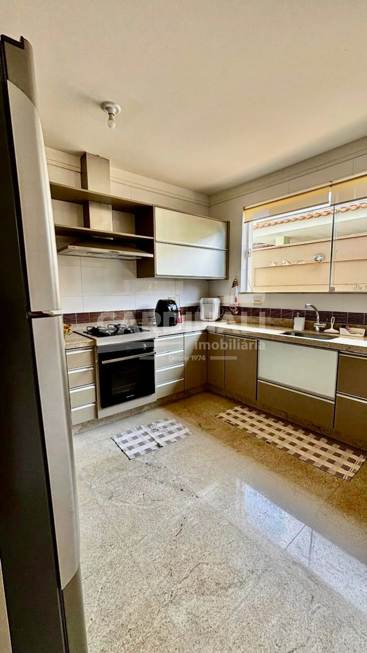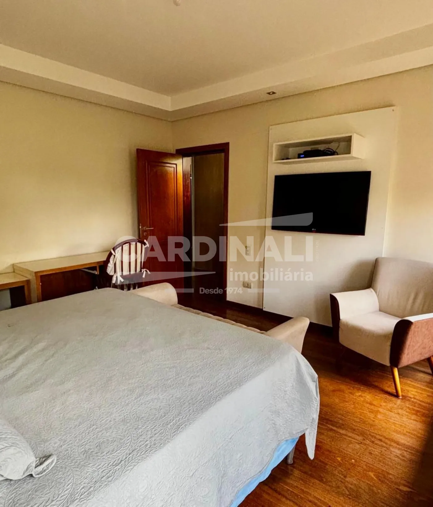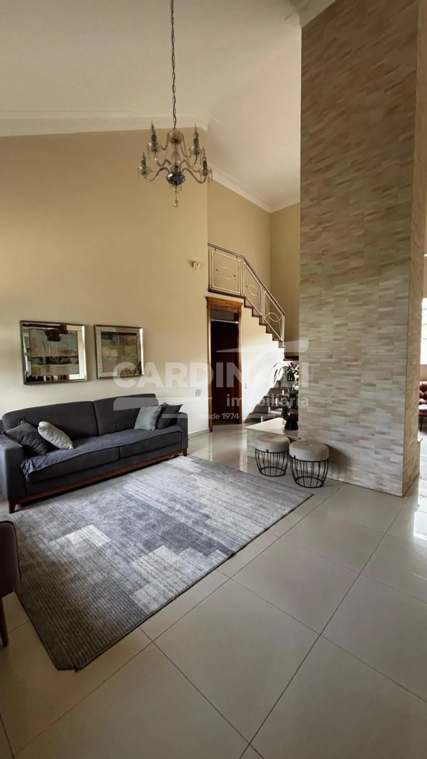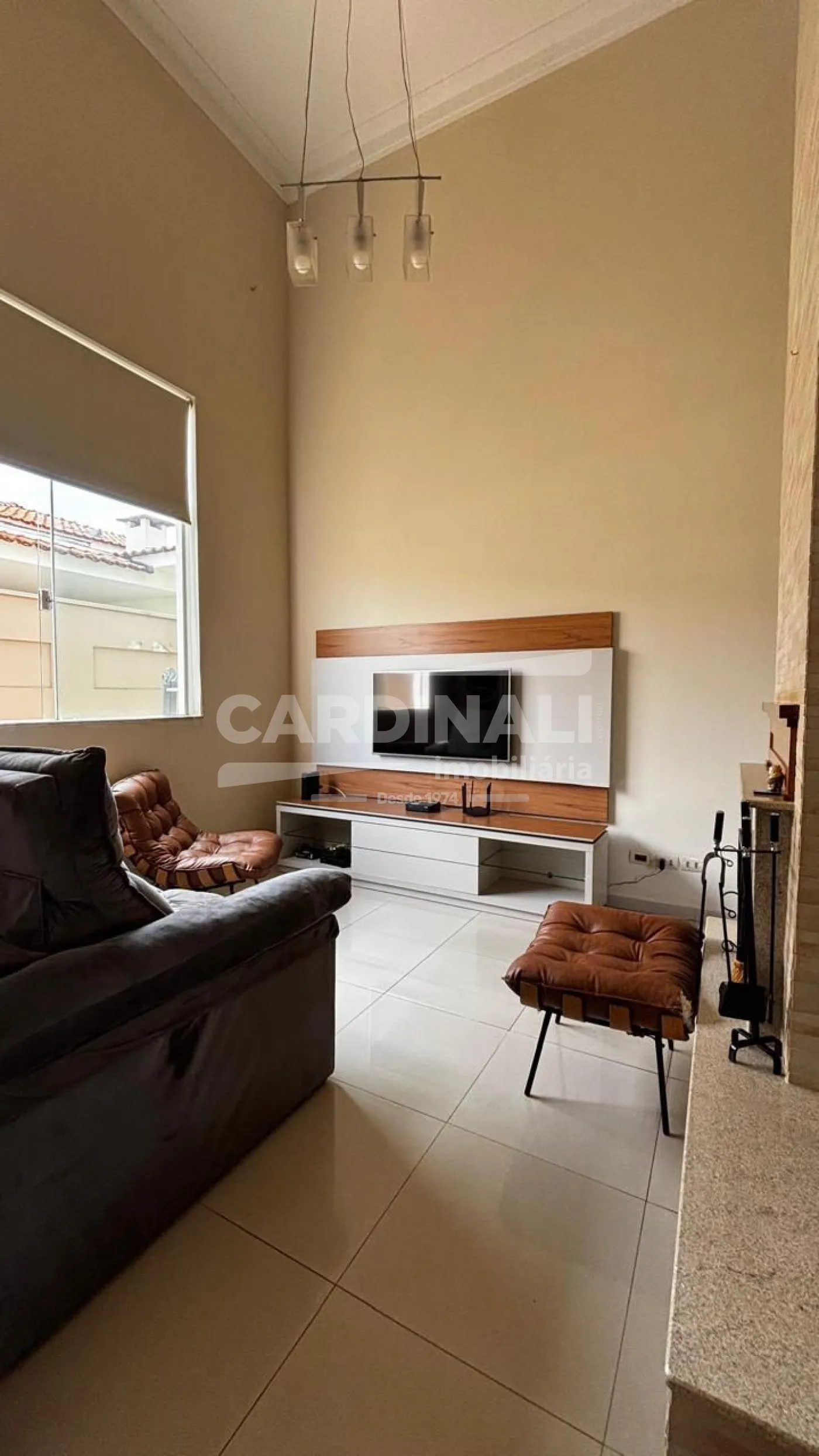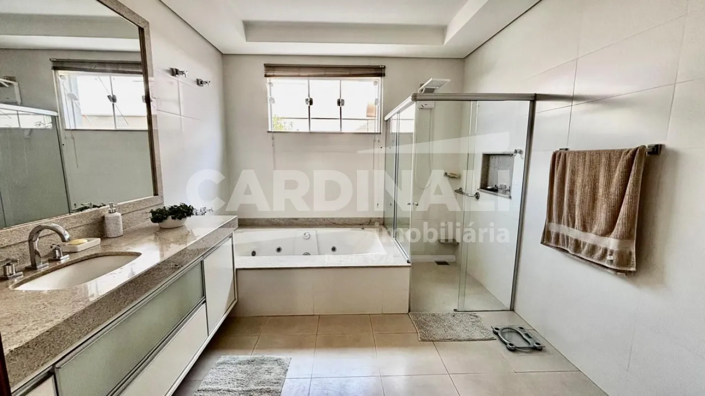 3 dormitórios com armários, sendo 3 suítes, 1 suíte no piso superior e 2 no piso térreo, suíte master com lareira e closet, banheira com hidromassagem, localizada no piso inferior, 2 salas integradas (sala de estar e TV), lareira na sala, 1 sala de jantar, 1 cozinha com armários, 3 banheiros das suítes + 1 lavabo, 1 área de serviço com armários, 1 despensa, 4 vagas na garagem, sendo 2 cobertas