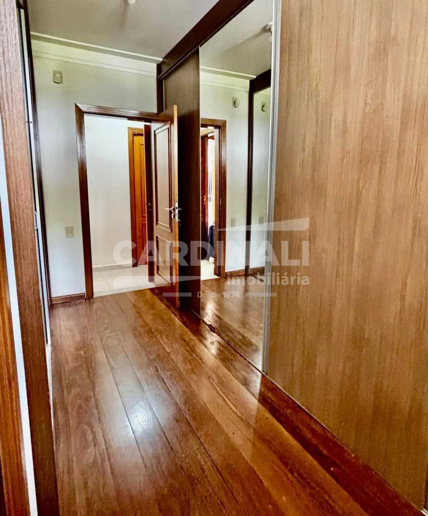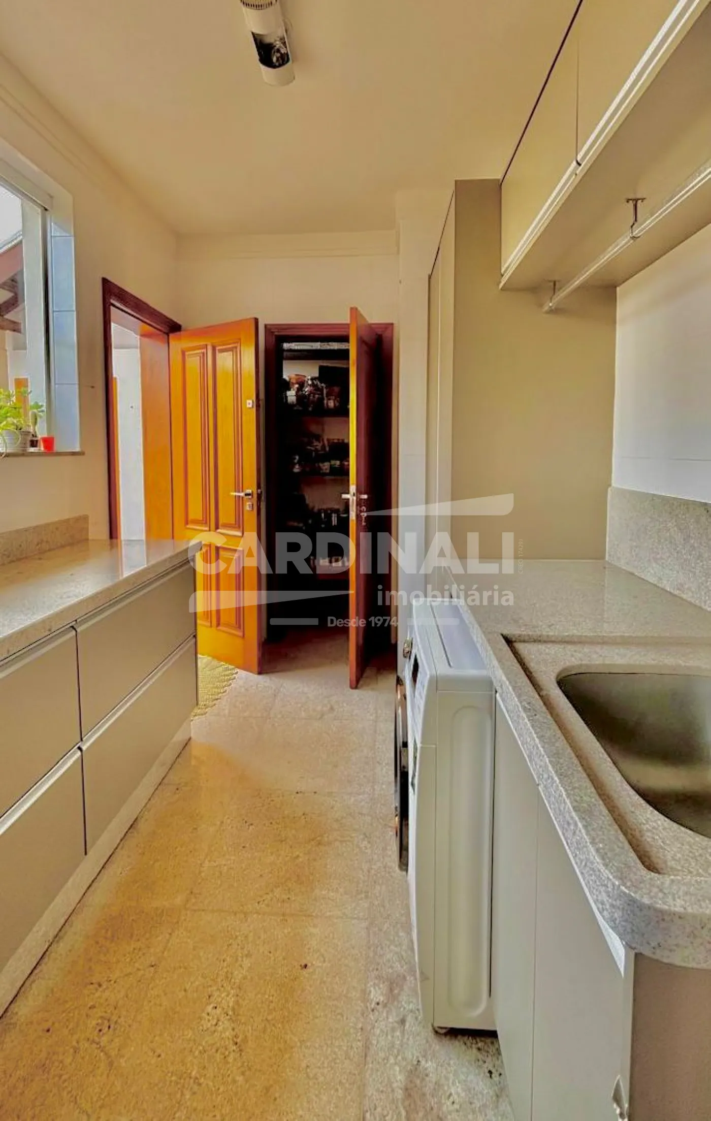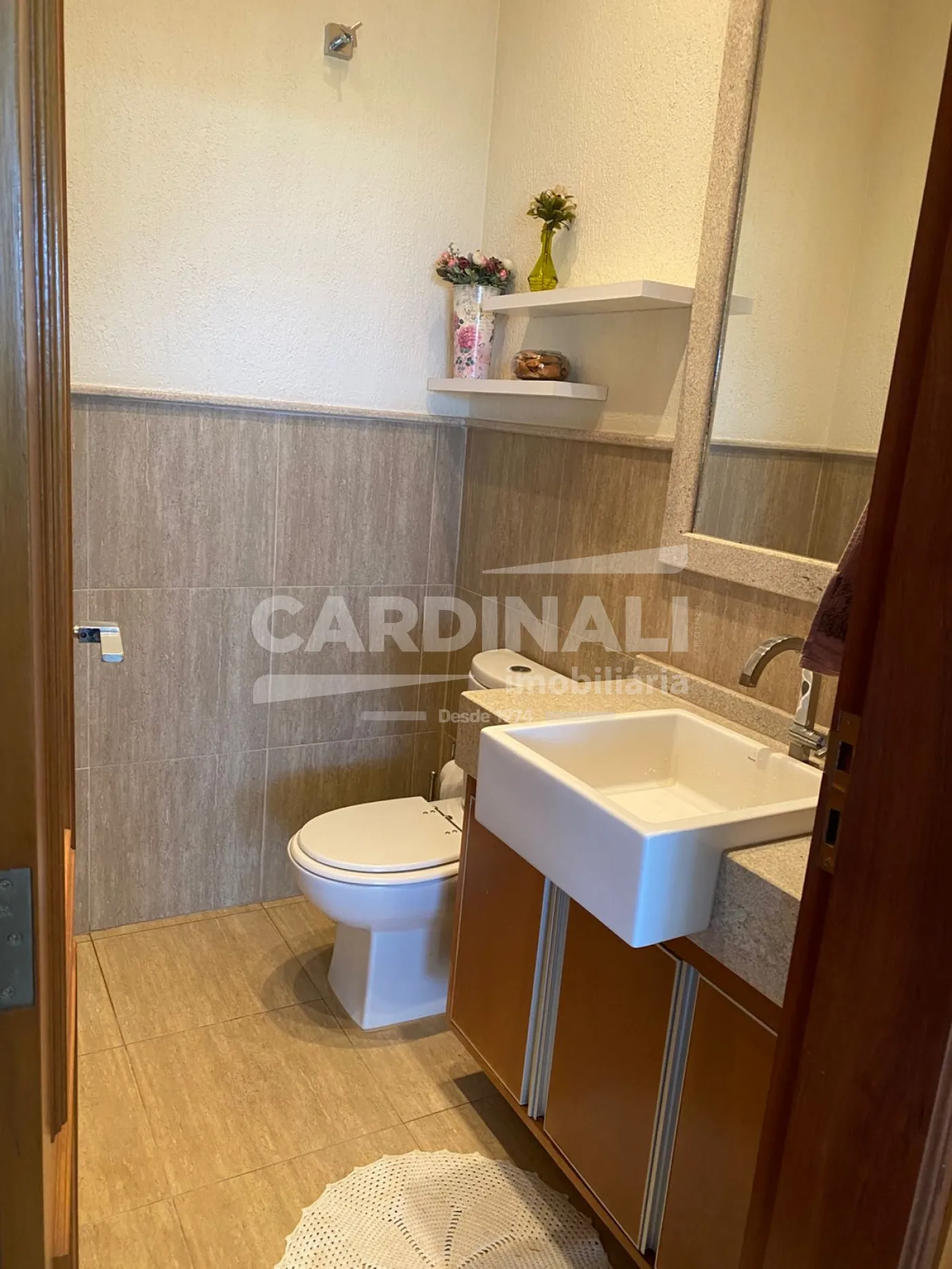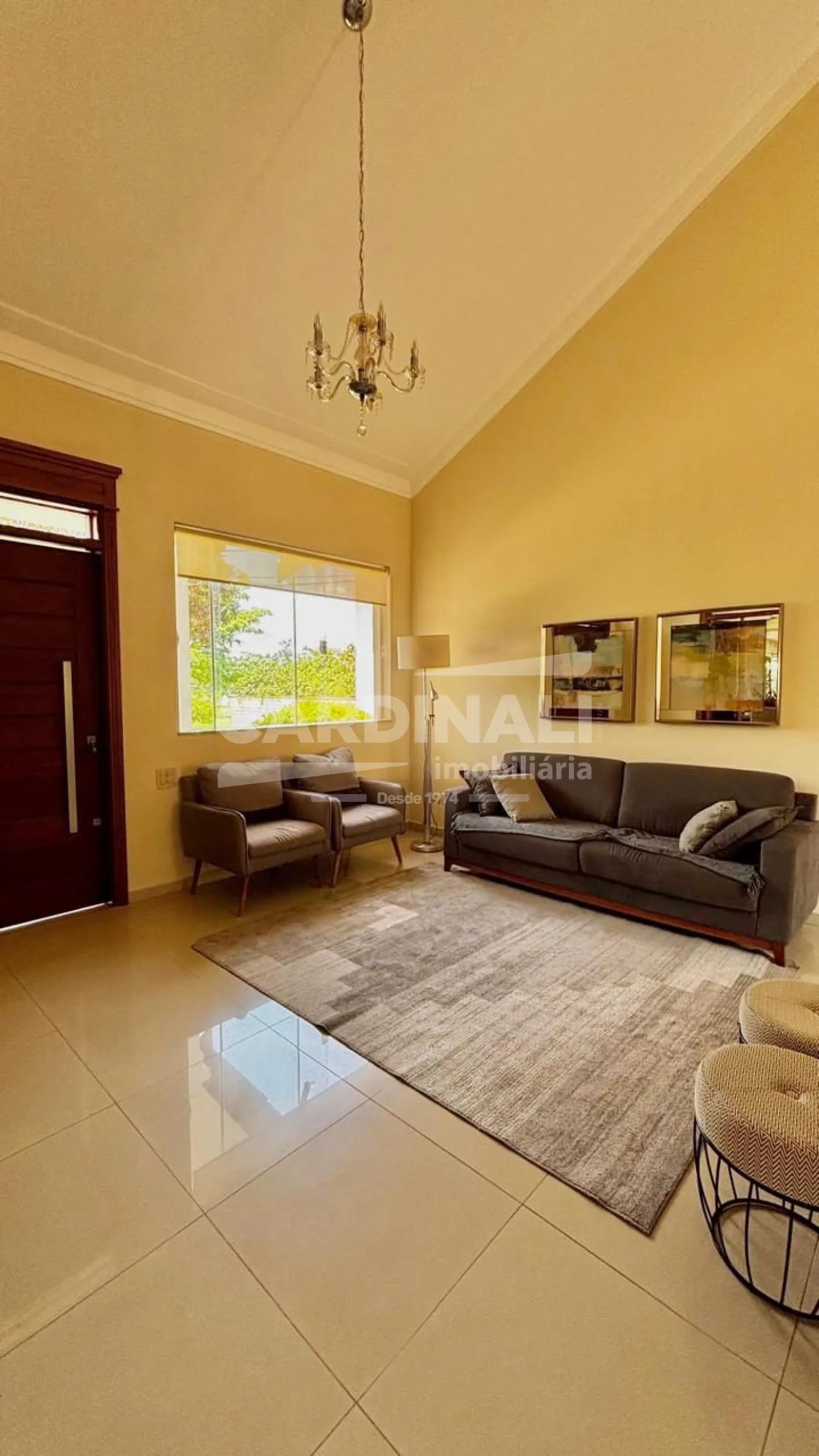 3 dormitórios com armários, sendo 3 suítes, 1 suíte no piso superior e 2 no piso térreo, suíte master com lareira e closet, banheira com hidromassagem, localizada no piso inferior, 2 salas integradas (sala de estar e TV), lareira na sala, 1 sala de jantar, 1 cozinha com armários, 3 banheiros das suítes + 1 lavabo, 1 área de serviço com armários, 1 despensa, 4 vagas na garagem, sendo 2 cobertas