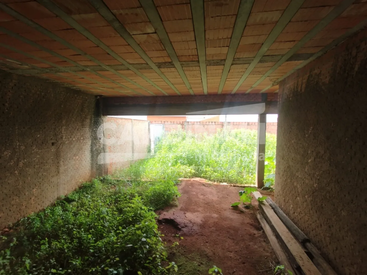 Quintal entre a casa e a edícula com corredor de uma lado da casa mais um espaço na frente.
