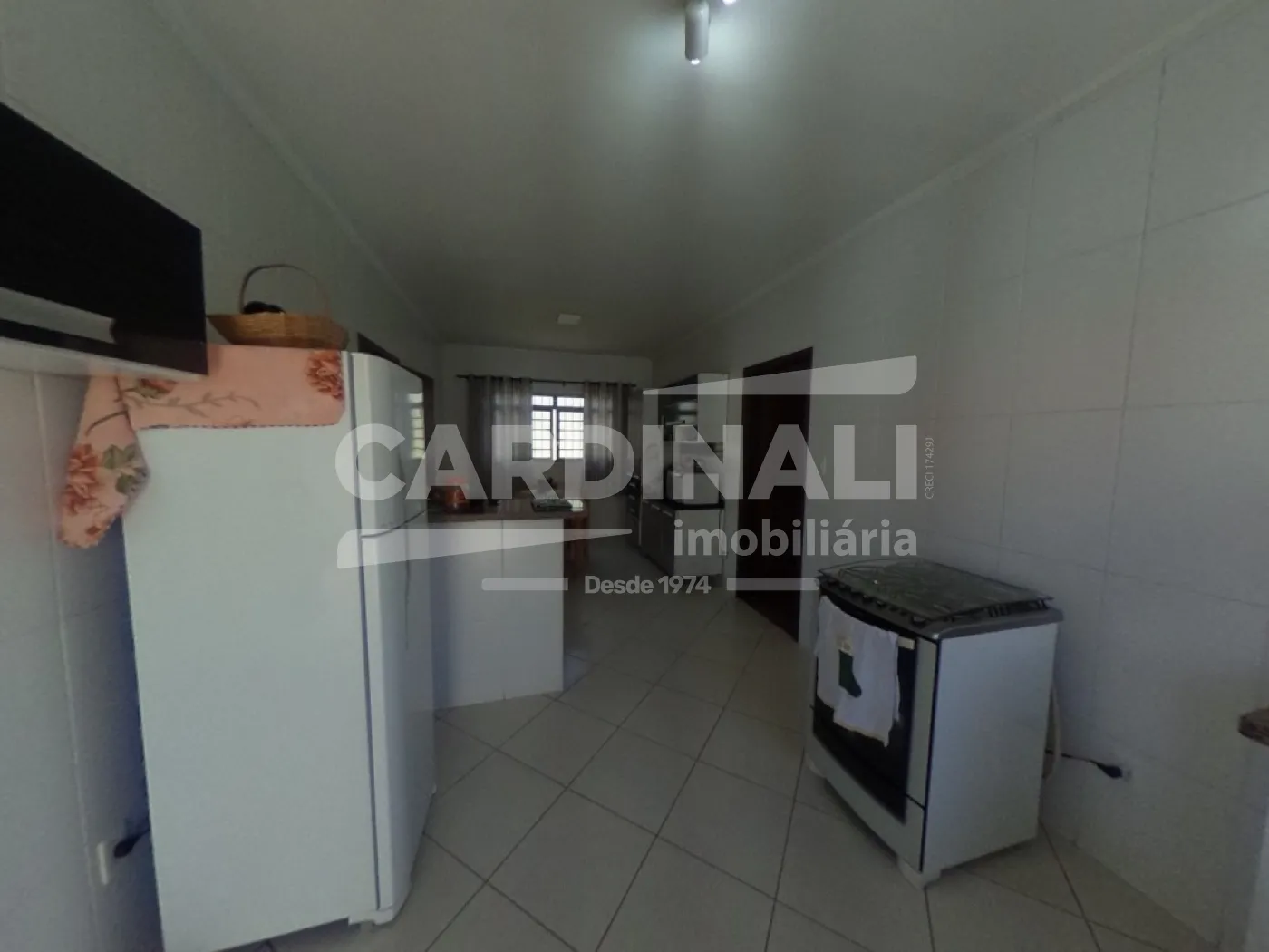 Casa térrea com 1 cozinha, 1 copa, 1 sala de TV com ventilador de teto, 2 dormitórios sendo 1 suíte, com ventilador de teto e 1 banheiro social.