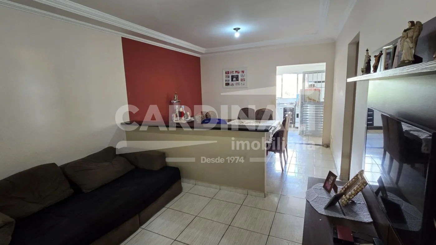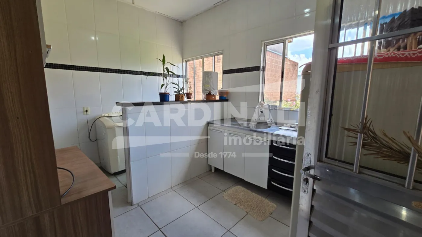 Casa possui 2 dormitórios, 1 banheiro, sala de estar e jantar, cozinha, lavanderia, amplo quintal gramado, 1 banheiro externo e vagas de garagem cobertas para 2 carros. Acabamento em piso frio na casa toda.