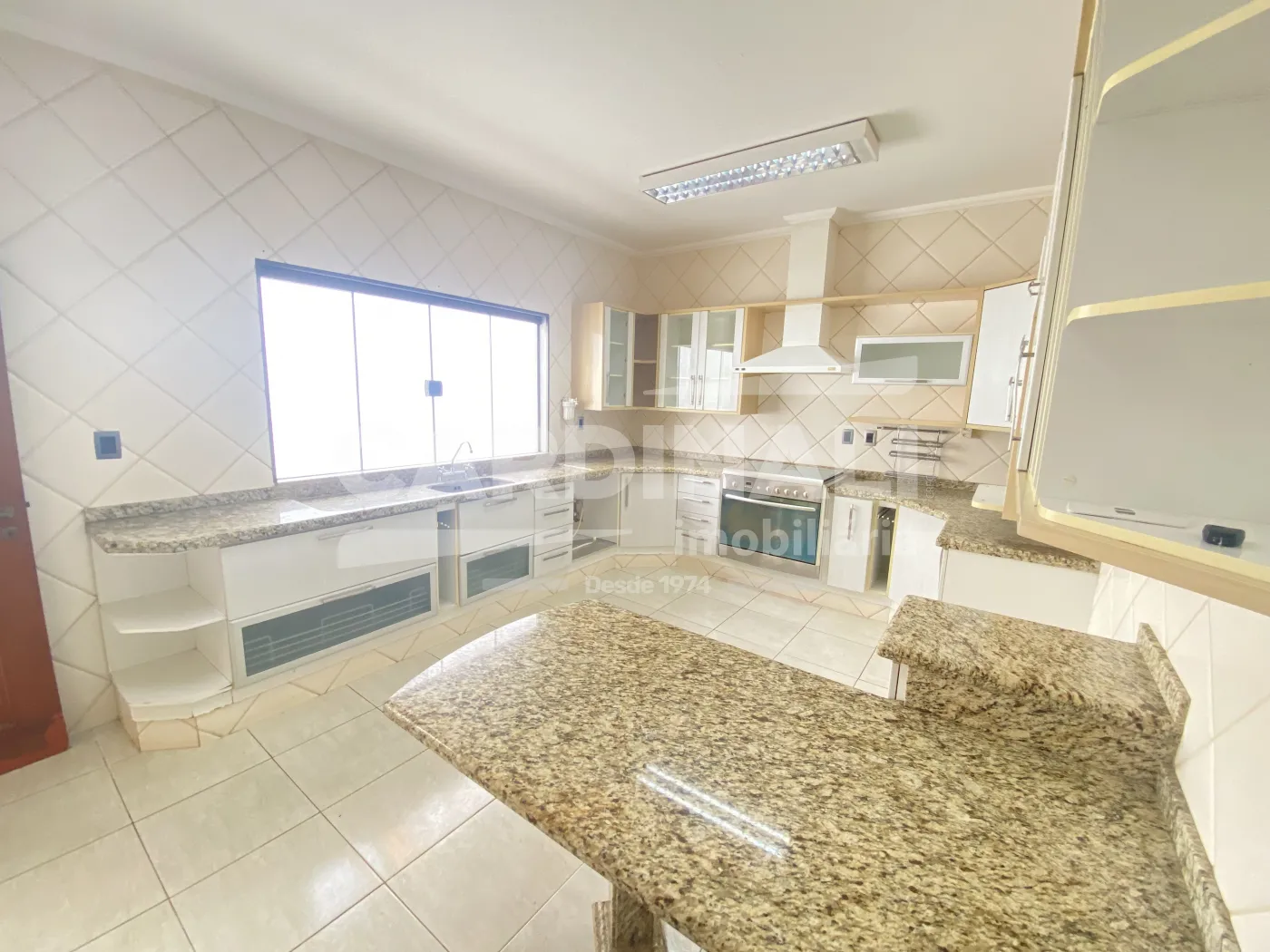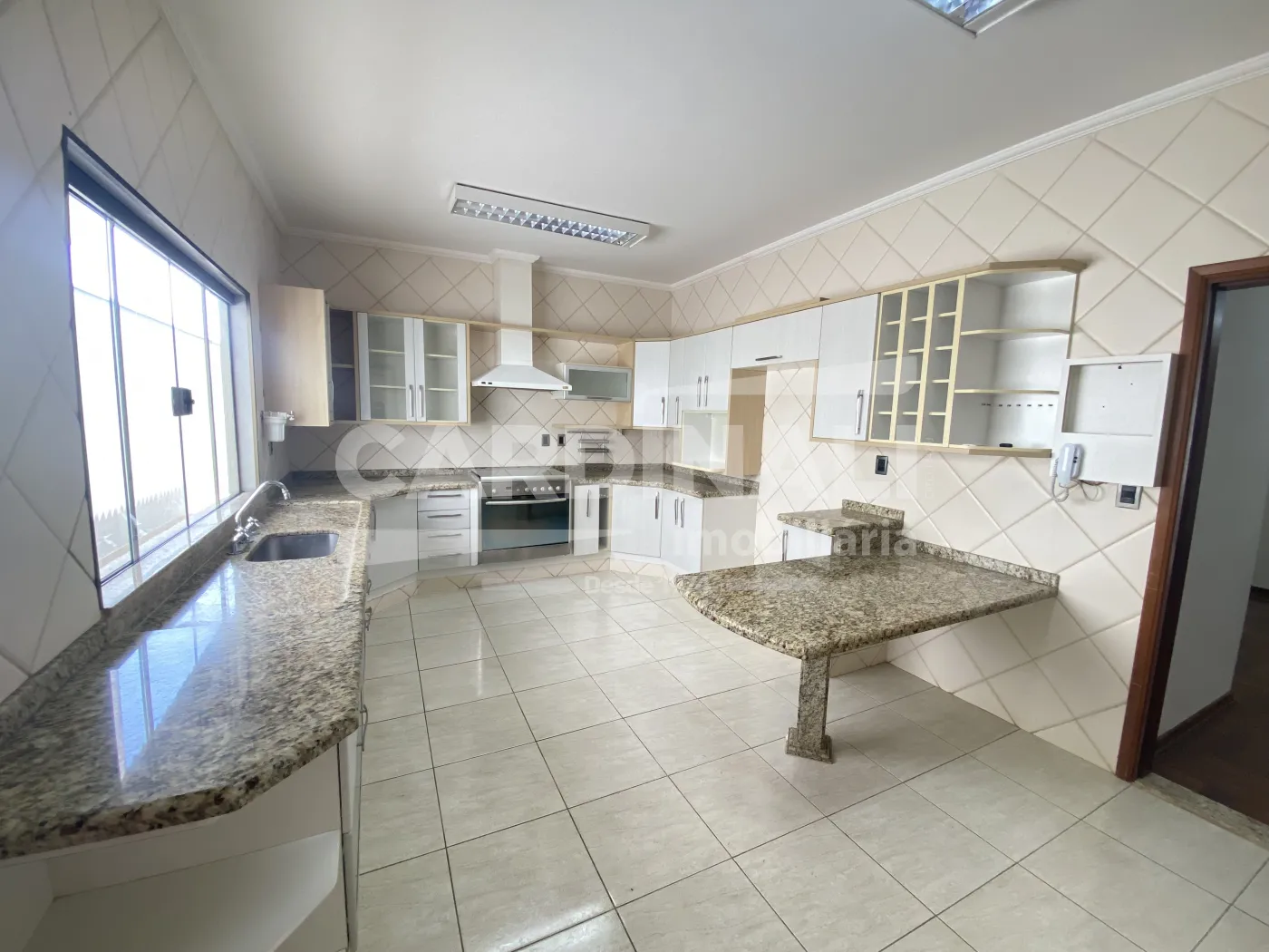 • Cozinha azulejada até o teto com armários e sistema de câmeras, proporcionando funcionalidade e segurança