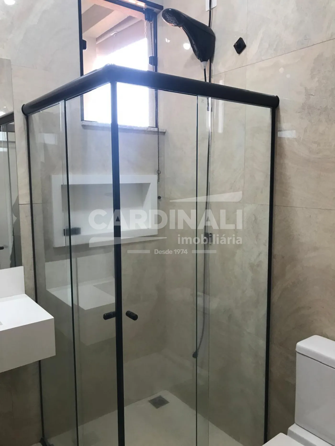 Banheiros com box de vidro e bancada em mármore