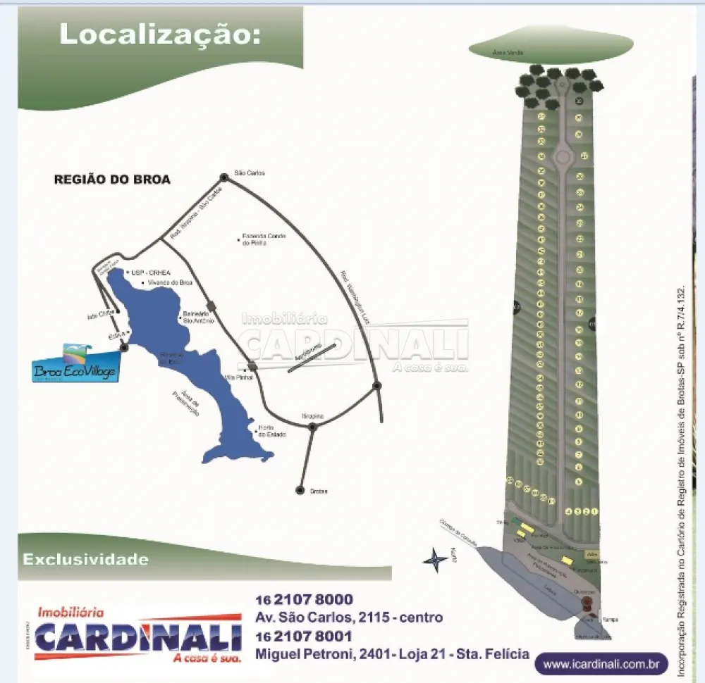Localizado no bairro Broa, em São Carlos, este lote está estrategicamente posicionado para unir a serenidade do campo com a conveniência da cidade. O acesso facilitado à represa aumenta o valor de investimento do terreno, enquanto a proximidade a São Carlos assegura acesso a todas as comodidades urbanas sem comprometer a paz e o espaço que só um condomínio exclusivo pode oferecer.